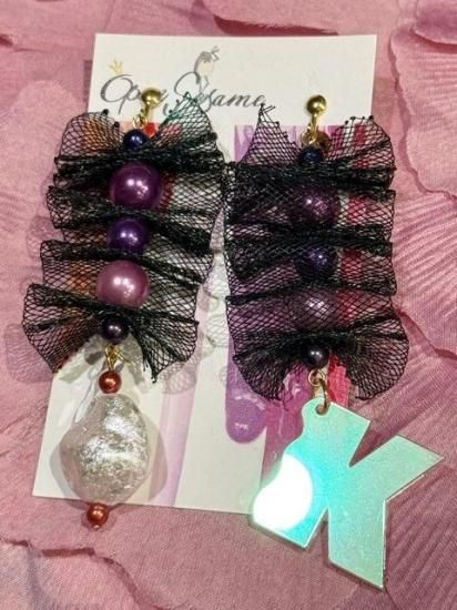 手染めのパールとたっぷりのチュールリボンが印象的なアシンメトリーピアス。16KGP金具使用で肌にやさしく、大ぶりチャームが耳元を華やかに彩ります